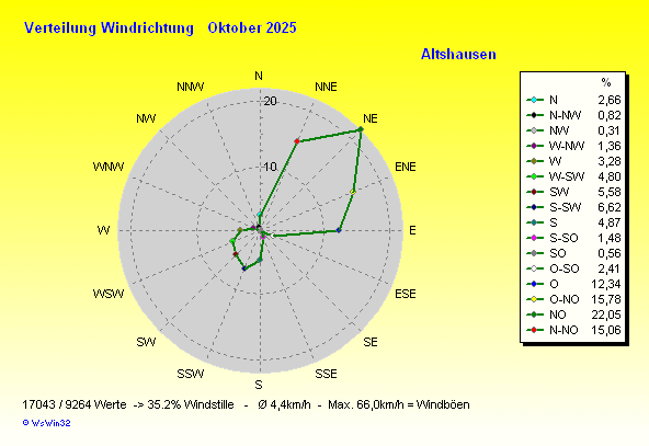 4 Oktober | 11,1 °C | 6,1 °C | um 00:55 | 19,2 °C | um 14:19 | 71 % | 1009,4 hPa | 2,2 l/m² | 11,3 km/h | 66,0 km/h | um 15:48 | S-SW | 0,00 h |
