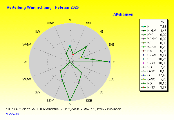 | 1 Februar | 0,5 °C | -0,6 °C | um 00:01 | 2,7 °C | um 15:32 | 83 % | 1007,9 hPa | 0,0 l/m² | 2,2 km/h | 11,3 km/h | um 20:13 | S | 0,00 h |